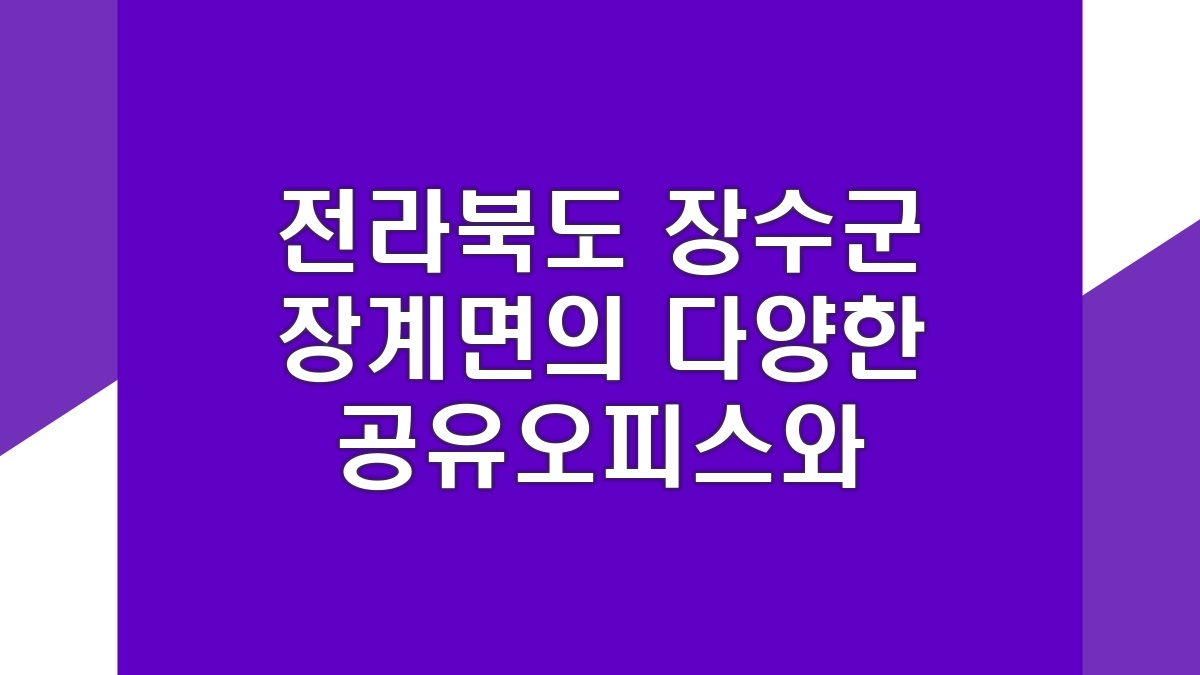 전라북도 장수군 장계면에서 다양한 형태의 공유오피스와 비상주사무실을 제공하는 곳 많다. 소호사무실로도 유명한 이 지역은 1인실부터 4인실까지 여러 옵션이 있어서 선택의 폭이 넓다. 개인이나 소규모 팀에게 적합한 공간을 찾기 좋은 곳 같음. 주차공간도 마련되어 있어서 접근성도 나쁘지 않다. 또한, 사무실 내의 시설도 깔끔하고 쾌적하니 업무에 집중하기 좋은 환경임.
